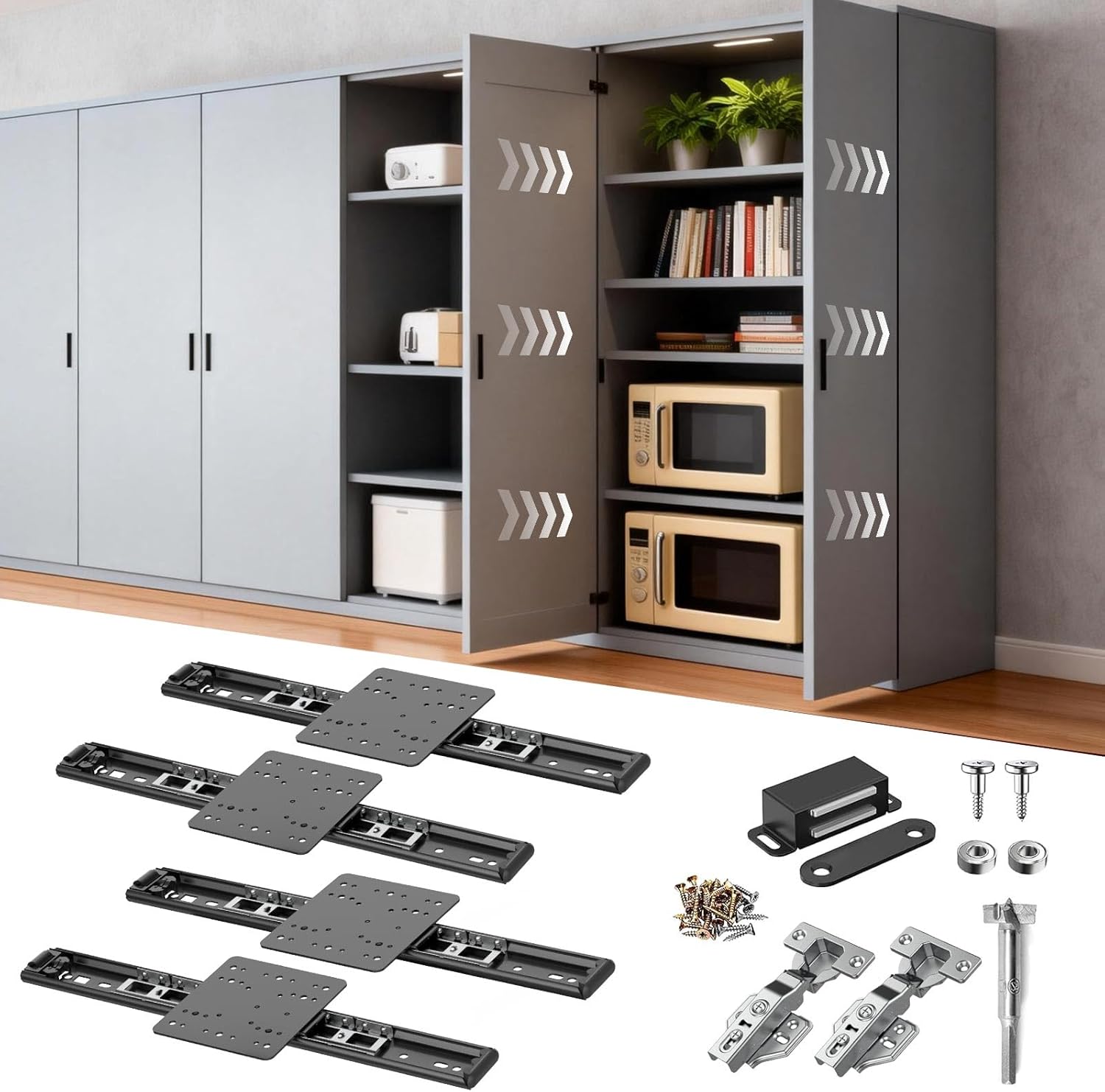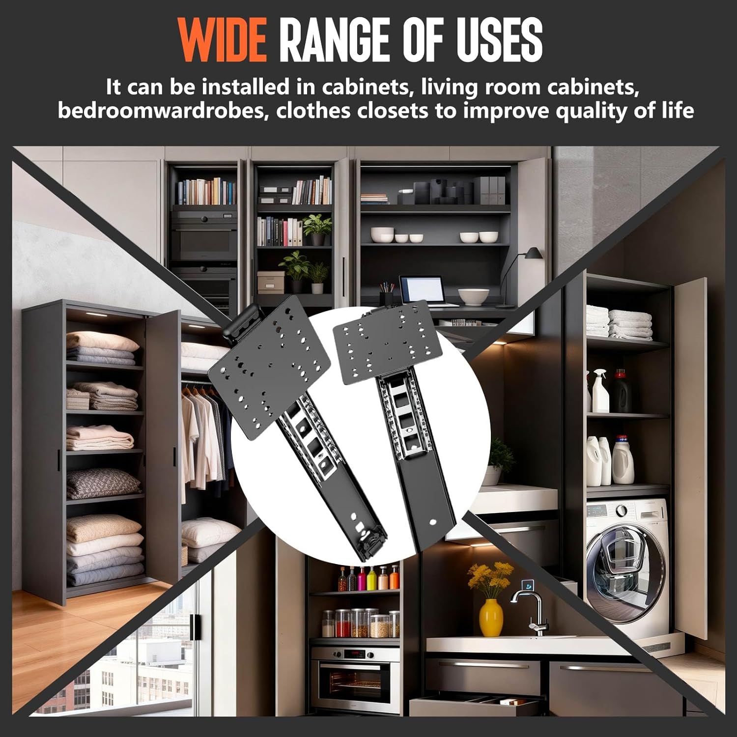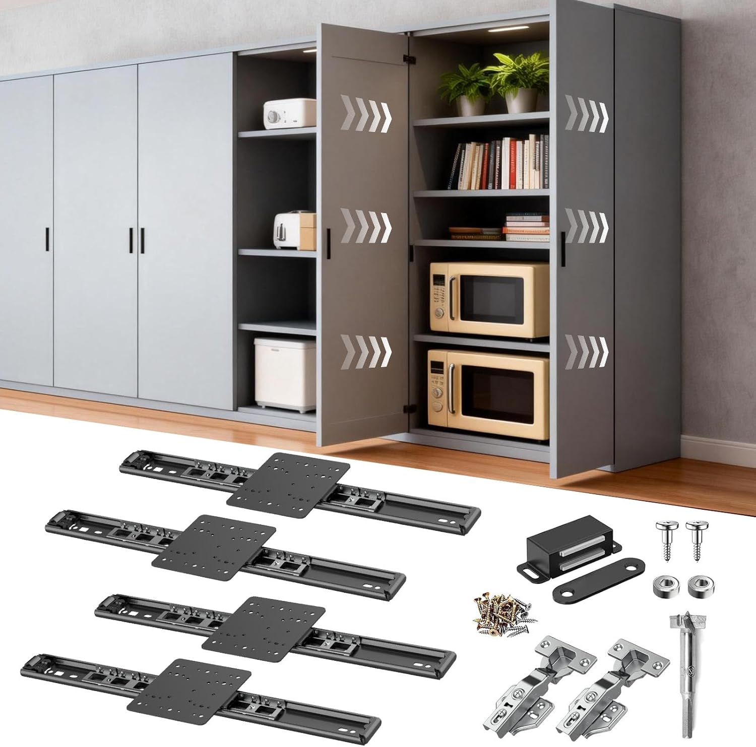 Crafted from high-strength steel alloy with precision ball bearings, this system ensures ultra-quiet, corrosion-resistant operation. The reinforced steel construction offers superior load capacity, while cushioned pads enable smooth, silent sliding for cabinet and inset doors.Its hidden track design maximizes space, allowing doors to seamlessly retract into walls—ideal for kitchens, closets, and tight areas. DIY-ready kits include slides, hinges, drill bits, and mounting hardware for tool-free installation. Available in 12"-24" sizes to fit various cabinet depths.Select models feature a sleek low-profile design with magnetic push-pull for effortless operation.