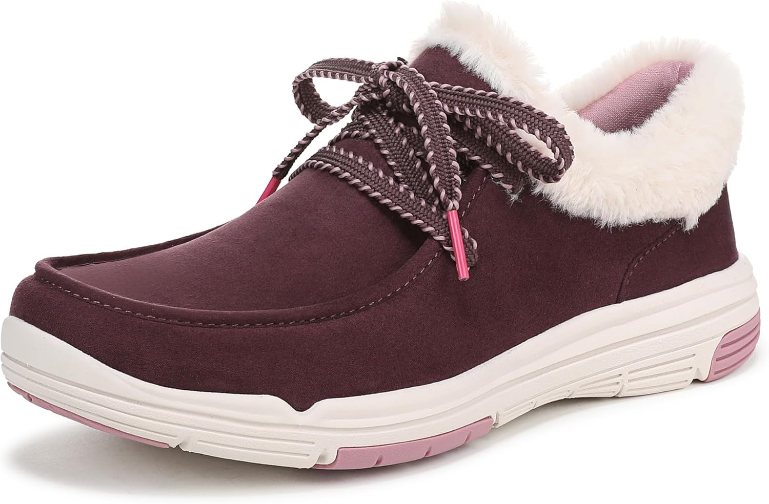 A cozy slip-on for winter days. Slip on these casual water-repellent shoes for luxurious, all-day comfort. BEST FOR: Cold-weather boots for casual walking + Everyday wear. PERFORMANCE TECH: RE-ZORB® responsive cushioning in the midsole for impact protection + shock absorption. MADE FOR WOMEN FIT: Designed for a woman’s unique foot shape, movement, and build with a narrower heel, roomier toe, and softer foot cushioning. MATERIALS: Water-repellent embossed suede leather with cozy faux fur trim. CLOSURE: Slip-on with laces for a secure fit. INSOLE: Anatomical insole with extra arch support + heel support. MIDSOLE: Lightweight ACTIVfoam™ EVA for soft cushioning. OUTSOLE: Compression-molded rubber outsole for grip + durability. WEIGHT: 198 g/7 oz per shoe. HEEL-TO-TOE DROP: 3 mm.