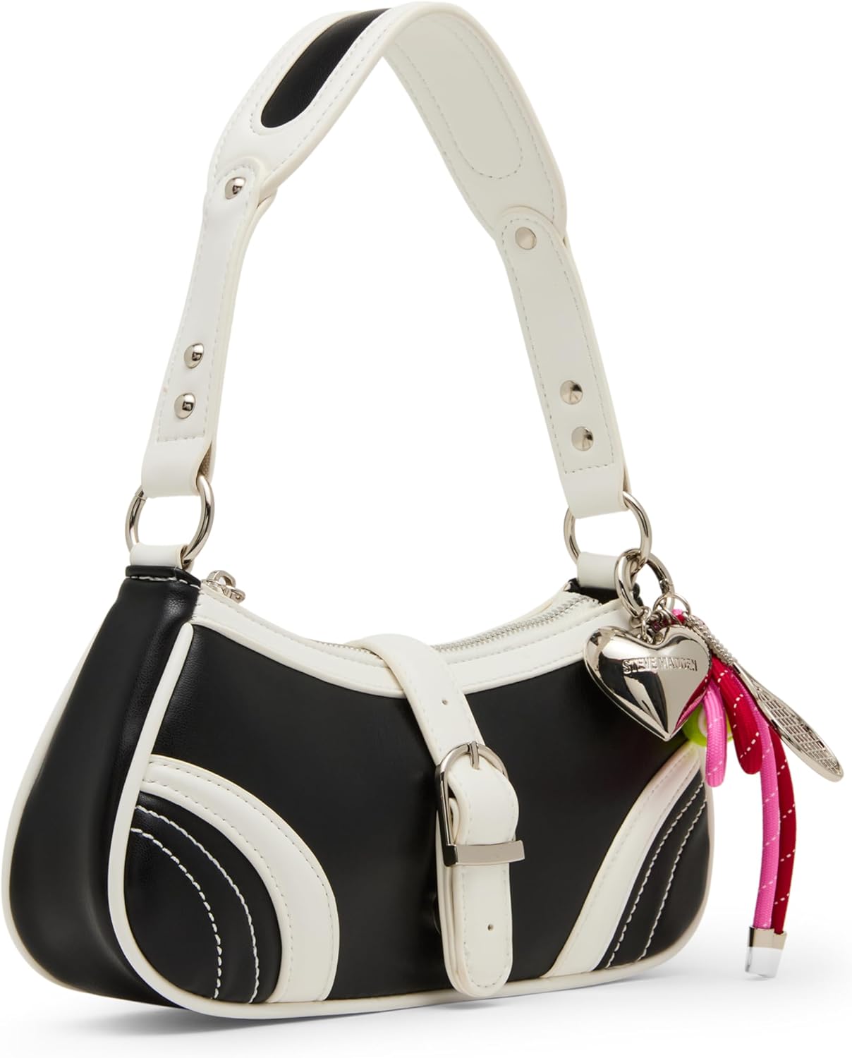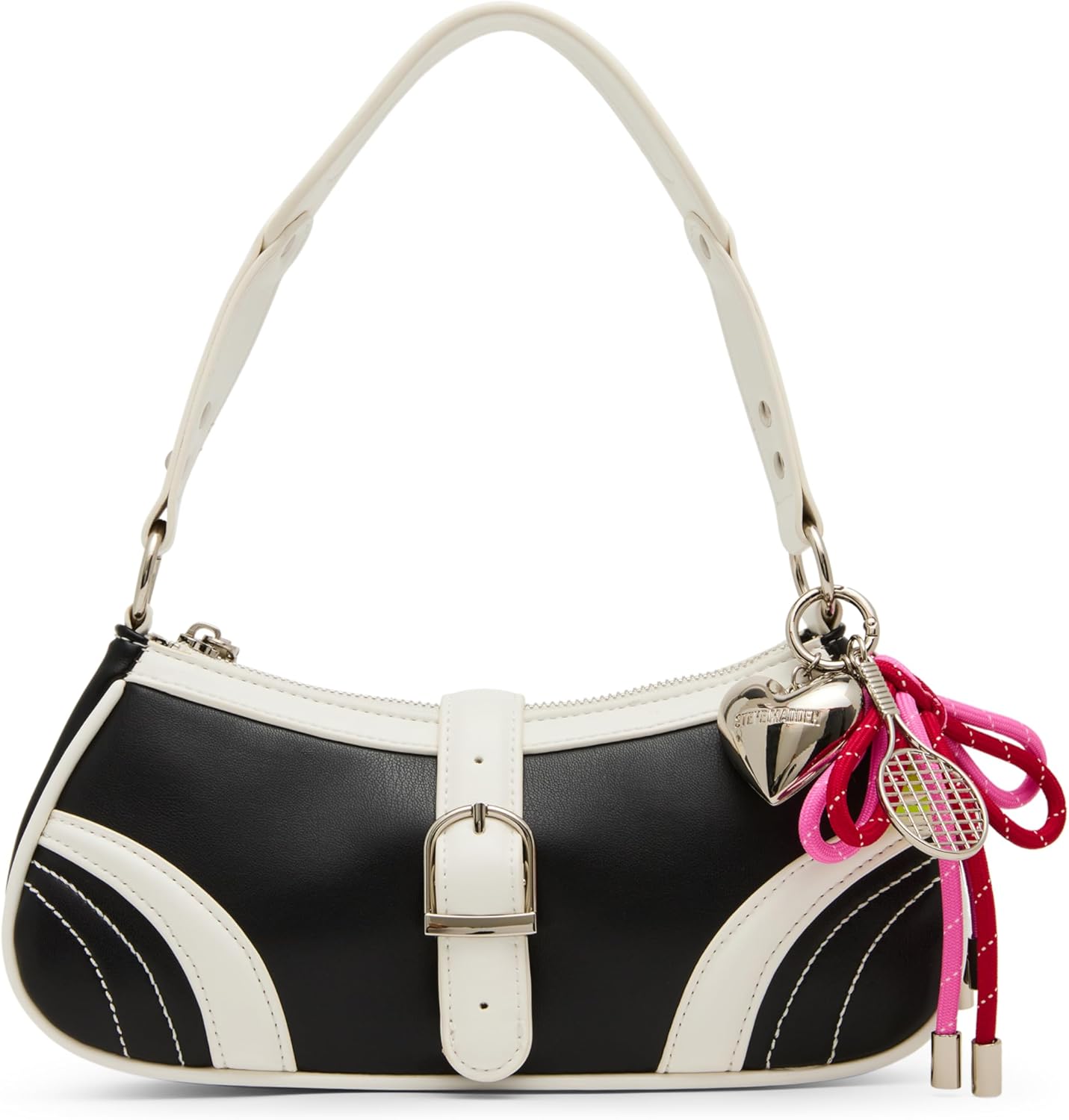 Striking Contrast. Timeless Style. A Sporty-Chic Twist. Turn heads with the Veloce shoulder bag. It is a modern classic that blends everyday elegance with a playful, athletic edge. The bold black silhouette is framed with crisp white piping, while buckle accents add a touch of structure and sophistication. What makes this bag truly unique? It comes adorned with a removable bag charm featuring a tennis ball, tennis racket, heart, and a cord bow—a fun, sporty detail that adds personality and charm to your look. Perfect for the fashion lover who doesn’t shy away from a little flair, this bag combines function, fashion, and a hint of fun in one standout piece.