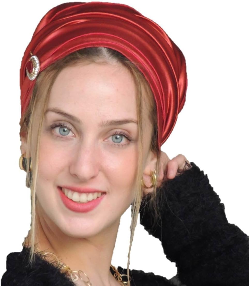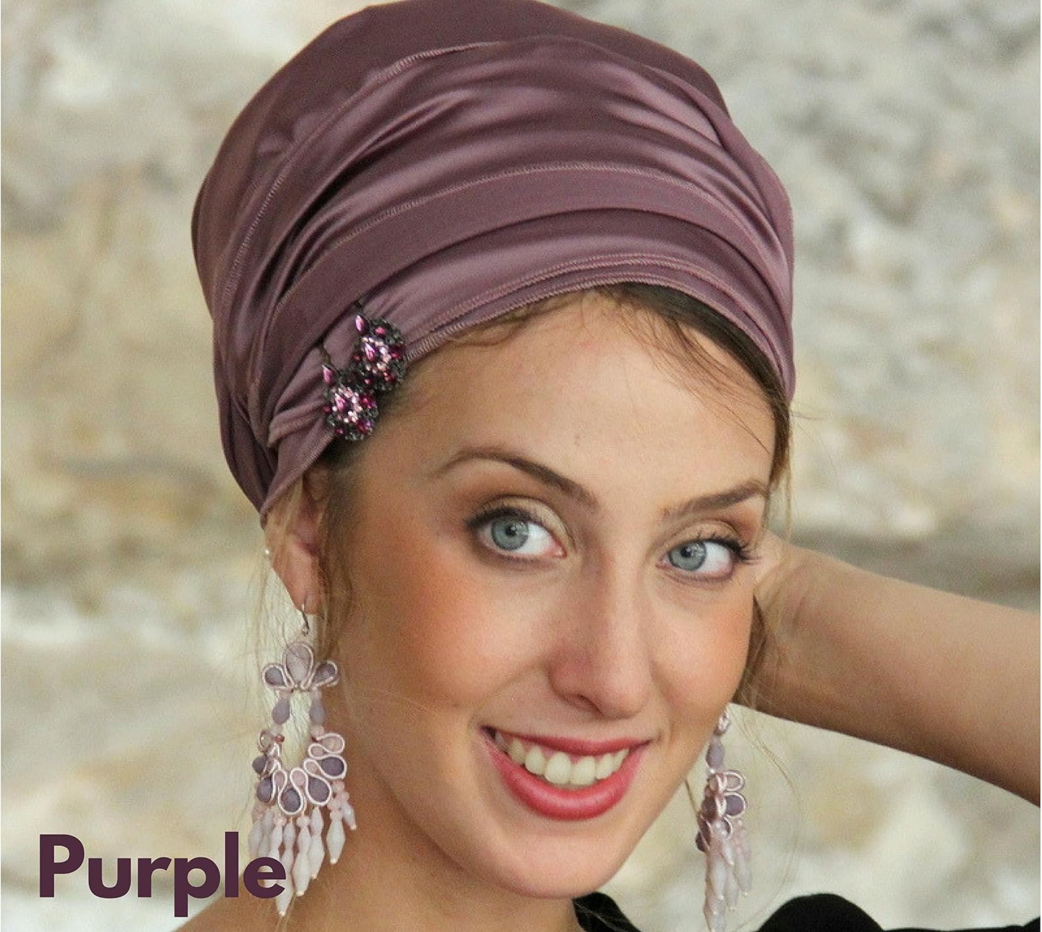 Designed Stretched Satin Turban Sinar handmade Mitpachat Head Covering, Scarf, Tichel, fashionable and comfortable. Beautiful colors design! For special occasion! or for anytime! Our head covering will make sure you get lots of compliments!!! The Mitpachat is about 200 cm. long and can be tied in different ways. This Mitpachat is worn for covering all hair and can be folded to show some hair. The fabrics are comfortable and are mostly made from quality elastic satin. In Hebrew, this type of Mitpachat is called a Sinar (apron), because of its shape. The Mitpachat is made from many different fabrics that give it a layered look, rich with colors.