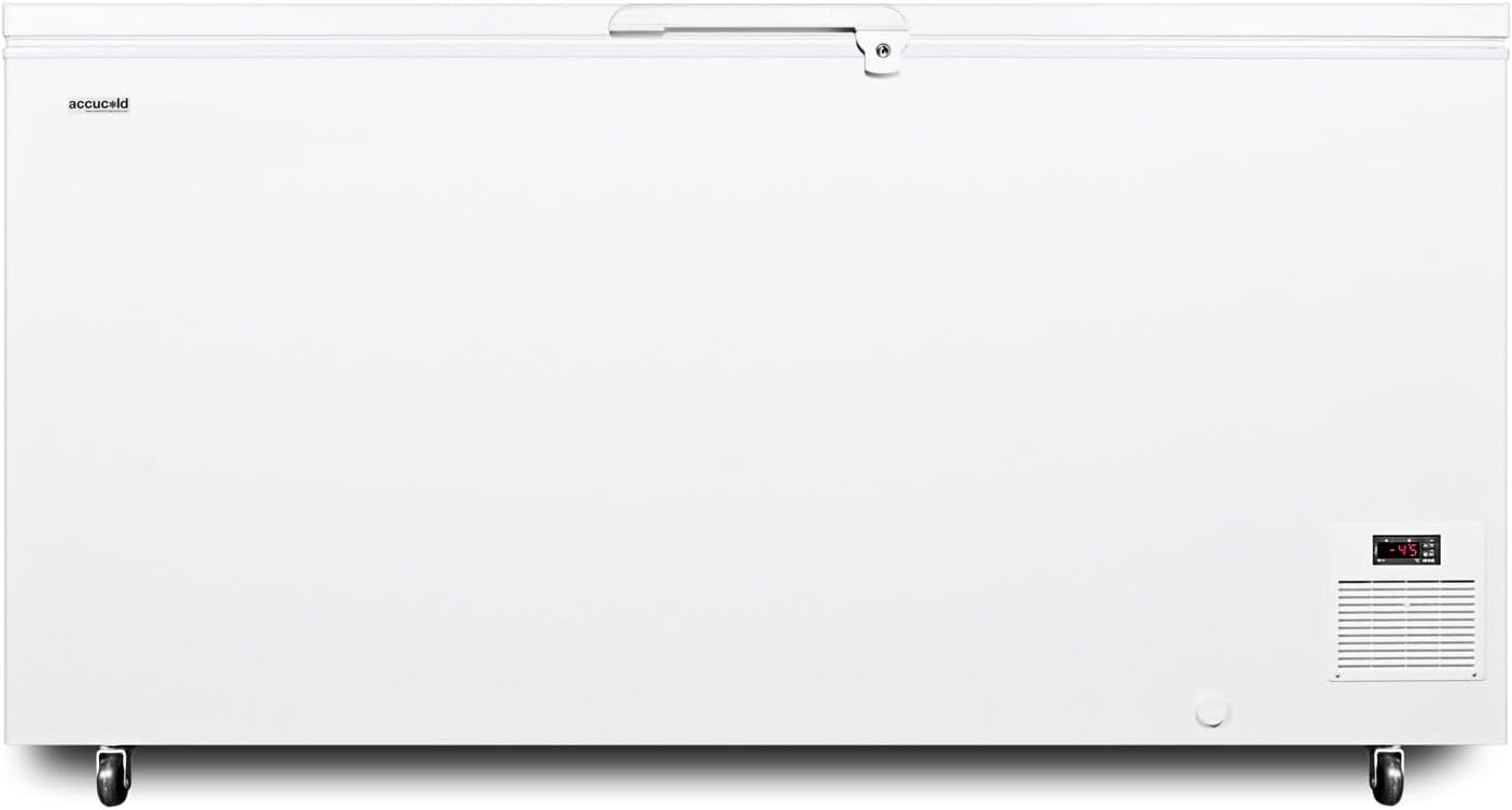 This 15.5 cu.ft. chest freezer uses static manual defrost cooling to maintain constant temperature, with an externally controlled digital thermostat to ensure easy temperature monitoring. Extra thick 4 ½" thick insulation offers added efficiency and reliability. Additional features include a solid, easy-grip handle complete with factory installed lock, a sturdy set of casters, and counterbalanced hinges for comfortable loading and unloading. This unit includes a factory-installed probe hole to allow users to install their own monitoring equipment.