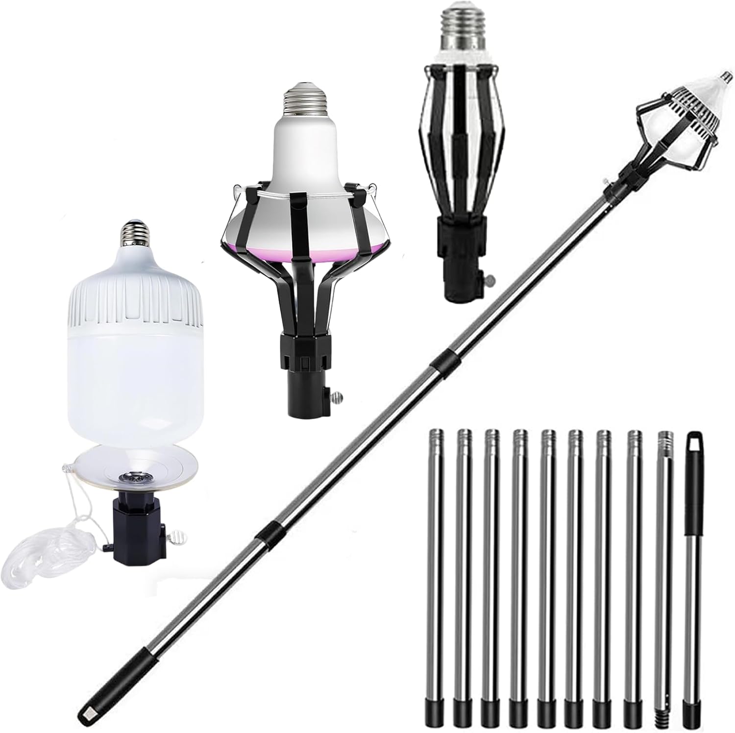 Upgraded 13FT Assembled Light Bulb Changer-Extension Pole – The Ultimate Solution for High Ceilings, Recessed, and Hard-to-Reach Lights Tired of risking your safety on shaky ladders just to change a light bulb? Our professionally engineered Light Bulb Changer with Extension Pole is designed to make bulb replacement quick, secure, and effortless. Reach heights of up to 12 feet safely from the ground, transforming a daunting chore into a simple, one-person task. Perfect for vaulted ceilings, recessed lighting (can lights), ceiling fans, porch lights, and other overhead fixtures in your home, garage, or workplace. Product Core Features-Benefits: Extended, Secure Reach:The assembled 12-foot lightweight yet durable fiberglass extension pole provides a safe, stable alternative to ladders. Its non-conductive material ensures added safety during electrical maintenance. Upgraded Universal Grip-Suction Cup:Features a premium, flexible rubber suction cup that securely attaches to most smooth or textured bulb surfaces (standard A19, globe, and vanity bulbs). The enhanced grip ensures bulbs are held firmly during both installation and removal, preventing drops and breakage. Dual-Function Remover Baskets:Included specialized baskets safely catch and remove broken, stubborn, or shattered bulb bases from sockets. A must-have tool for handling unexpected breaks without direct contact. Effortless Assembly-Storage:The pole easily assembles and disassembles into compact sections in seconds. No tools required. Store it conveniently in a closet, garage, or utility room. Versatile-Multi-Purpose:Ideal for households, landlords, maintenance professionals, and commercial use. Effortlessly change LED, CFL, incandescent, and halogen bulbs in recessed light fixtures, high ceilings, stairwells, warehouses, and more. Specifications-Kit Includes: Max Working Height:12 Feet (Assembled). Components:3 x 4ft Interlocking Fiberglass Pole Sections, 1 x Upgraded Grip Head with Suction Cup, 2 x Specialized Bulb Remover Baskets (for broken and stuck bulbs). Compatibility:Fits most bulb shapes and sizes up to 4 inches in diameter (standard base E26/E27). Not for use with small chandelier bulbs (candelabra base E12). Say Goodbye to Ladders and Hassle! Regain your peace of mind and maintain your lighting fixtures with ultimate ease and safety. Our comprehensive light bulb changing tool is the reliable, long-lasting solution you’ve been searching for. Order your Assembled Light Bulbs Extension Pole Changer today and light up your space without the climb!