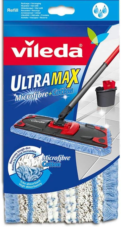 " Effective wet cleaning with the Vileda Ultramax microfibre + cotton mop cover. The Vileda Ultramax microfibre + cotton makes your tile and stone floors shine. The mop cover is compatible with the Vileda ULTRAMAX wiping system and ensures effective wet cleaning. It can be quickly attached to the wiper plate of the floor mop thanks to the press studs so you can get started right away. The mop cover is made of high-quality microfibre and cotton, absorbs water very well and releases moisture specifically to the floor. Therefore, it is particularly suitable for the extra-damp cleaning of tiles, tiles and stone floors and other insensitive floors in the home. Loop fibres ensure effective dirt absorption. Red power fibres thoroughly eliminate even stubborn dirt and stains. Clean and streak-free floors are left behind. The Ultramax microfibre + cotton mop cover is reusable and can be washed at up to 60 °C in the washing machine after cleaning. So you benefit from its cleaning power for a long time. Discover the Vileda Ultramax microfibre + cotton replacement cover and make your tile and stone floors shine.