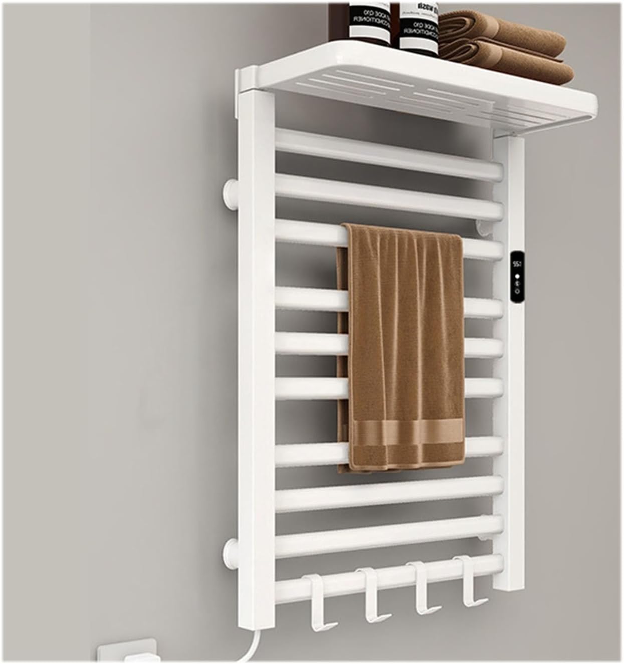 Product name: Electric towel rack, home use, intelligent constant temperature, drying, bathroom, toilet, towel bar, punch-free storage rackColor: black, white, grayMaterial: aluminum alloyTemperature: 30-70 ℃/86-158 °FPower supply: plug-inSurface treatment: electrostatic inkjetPower: 150 wPower timing: 1-9 hPower cord: 1.5 m spring wireInstallation method: punching/punching-freeScope of application: bathroom, kitchen, balcony, toilet, swimming pool, hotel and other places, simple design, multi-functional usePackage contents:1* towel heater1* installation accessoriesNotes:1.Due to manual measurement, the size error is 1-3cm. Errors may occur, please refer to the actual product.2. Due to monitor settings and lighting conditions, the color may be slightly different from the listed photos