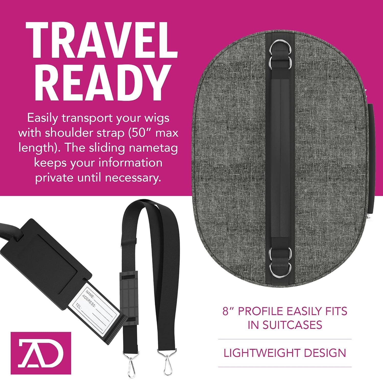 The upgraded Travel Wig Case from Adolfo Design offers adjustable height options to safely store and transport wigs of all shapes and sizes. Featuring a collapsible foam wig head stand on the inside that rocks back and forth for easy styling on-the-go. A maximum height of 17 inches allows long hair to fall naturally without becoming tangled or misshapen.OPTIONS AT YOUR DISPOSALThe wig case has a double zipper extension that takes it from 8 to 10 inches, all the way to 12 inches for wigs with more curls and volume. The collapsible stand can be adjusted from 17, 14, 11, 9 all the way down to 6 inches for long wigs and short bob wigs.WORLD TRAVEL READYGo almost anywhere with your favorite wig! This carrying case combines the art of wig styling with the convenience of portability. Can’t decide which wig to bring on your next trip? Grab two Adolfo Travel Wig Cases just to be safe!STYLISH MODERN DISPLAYSo much chicer than your grandmother’s foam mannequin head... Neutral foam stand provides grip to keep wigs in place for cutting, washing and styling. Display in your home, storefront or salon and pack it up easily at the end of the day.PRODUCT FEATURES:5 Wig Stand HeightsDouble Zipper Extension12 Inch Maximum Case HeightQuilted Nylon ExteriorRigid Inner Plastic WallPortable Carry HandleName Tag SlotTiltable Styrofoam HeadKeep wigs and toupees in pristine condition whether curly, straight, wavy, crimped or any other style. A great gift for cosmetologists, student stylists and wig makers.Available in 6 Colors: Navy, Burgundy, Denim Navy, Denim Burgundy, Denim Black, Denim Silver