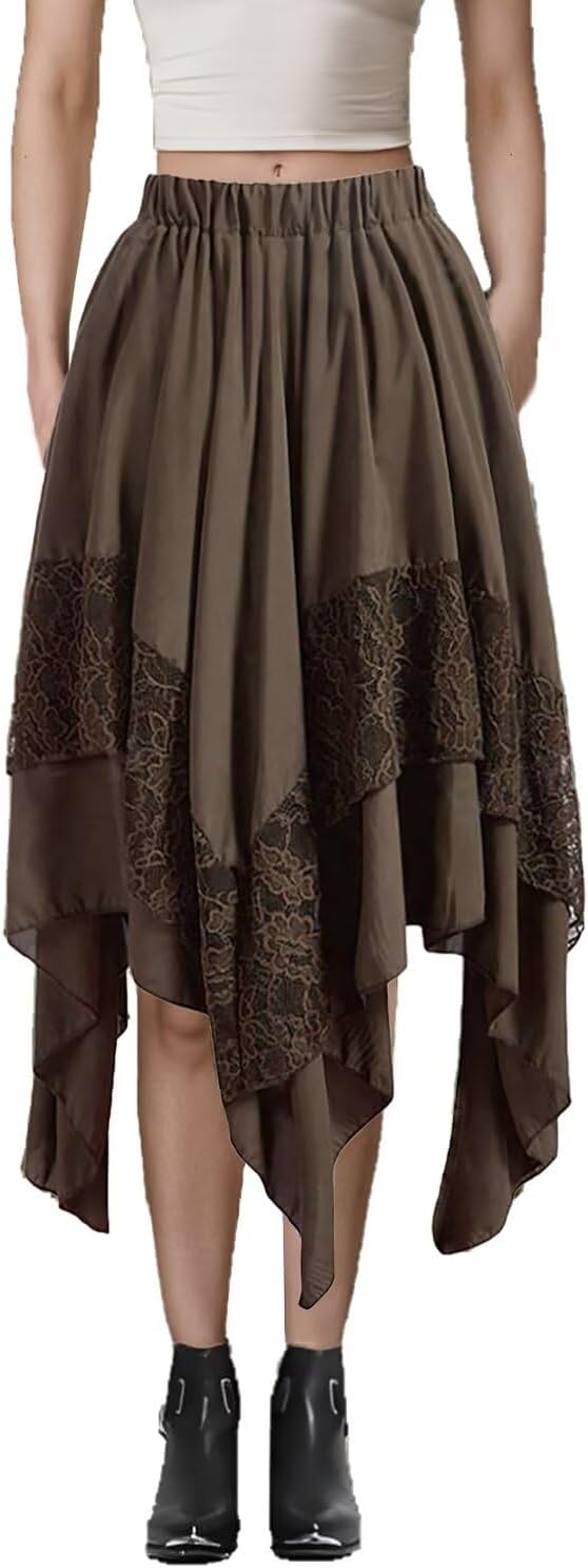 Step into the spotlight with this dramatic Renaissance Gothic Skirt. Designed with an asymmetrical layered hem, lace details, and a flattering A-line silhouette, this skirt blends vintage elegance with a bold steampunk vibe. Timeless Silhouette: Asymmetrical hem and tiered layers create dynamic movement. Thoughtful Details:Delicate lace trim and double-layer construction for depth. Day Comfort: Soft polyester fabric with flexible elastic waistband. Endless Styling - Lace Corset top & Victorian blouse - Off-shoulder top & peasant Shirt & embroidered linen top - Steampunk boots - Fishnet stockings, or layered belts and chains Unlimited Adaptation - Renaissance fair & Halloween party - Steampunk gathering & gothic wedding - Pirate cosplay & theater performances & Christmas masquerades - bohemian inspired vacations & romantic dates CARE:Hand or Machine wash cold. Hang to dry. Size Note Available in sizes M to XXL, suitable for different body types. Please refer to the size chart before ordering to ensure the best fit. Color Disclaimer Due to different device screen settings and lighting conditions, the color of the actual product may vary slightly from the images. Please consider the actual product as the standard.