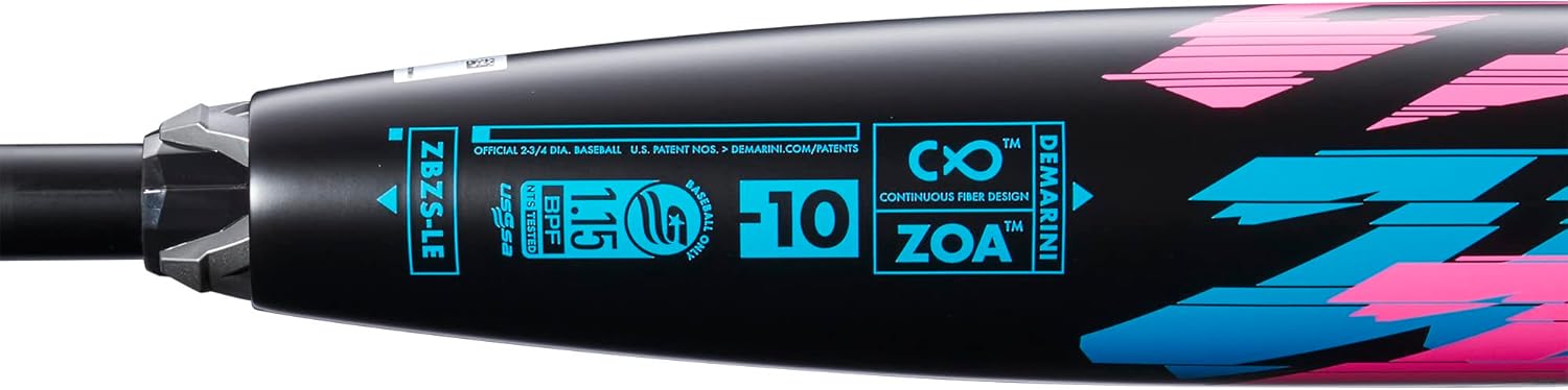 Pour it on. The limited edition 2022 Zoa Glitch (-10) USSSA Baseball Bat from DeMarini delivers the performance and feel of Continuous Fiber Composite Barrel construction with an all-new design to put the competition on notice. Spray hits to all fields and build a reputation on the travel ball circuit with Zoa’s two-piece composite build. The insanely consistent Continuous Fiber Composite Barrel is optimized to create a massive, elongated hitting area, and graphics in yellow, pink and blue make a bold statement to match the performance. The Zoa (-10) uses an Anomaly connection to pair the barrel with a stiff composite handle, maximizing energy transfer to post crooked numbers on the scoreboard.