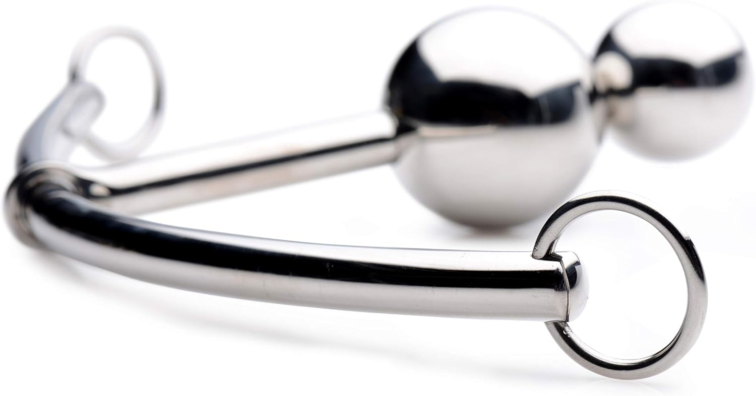 The DuoSphere is a devious combination of a double beaded, sliding anal plug and a curved bondage hook. One by one you can pop the cool steel balls in. Once you slide the plug home, you are now free to adjust its position along the length of the bondage hook to suit your needs. Each end of the curved steel bar features a pivoting O-ring that allows you to attach ropes, chains, or whatever creative bondage equipment you have in mind. The top bead of the anal plug is removable, so you can choose whether your sub will experience both of the steel spheres or just one. Warm or cool the DuoSphere in water prior to insertion for some exciting temperature play. Measurements: Bondage Hook is 8.25 inches long, Anal Plug has 4.13 inch insertable length, 1.62 inch max insertable diameter.