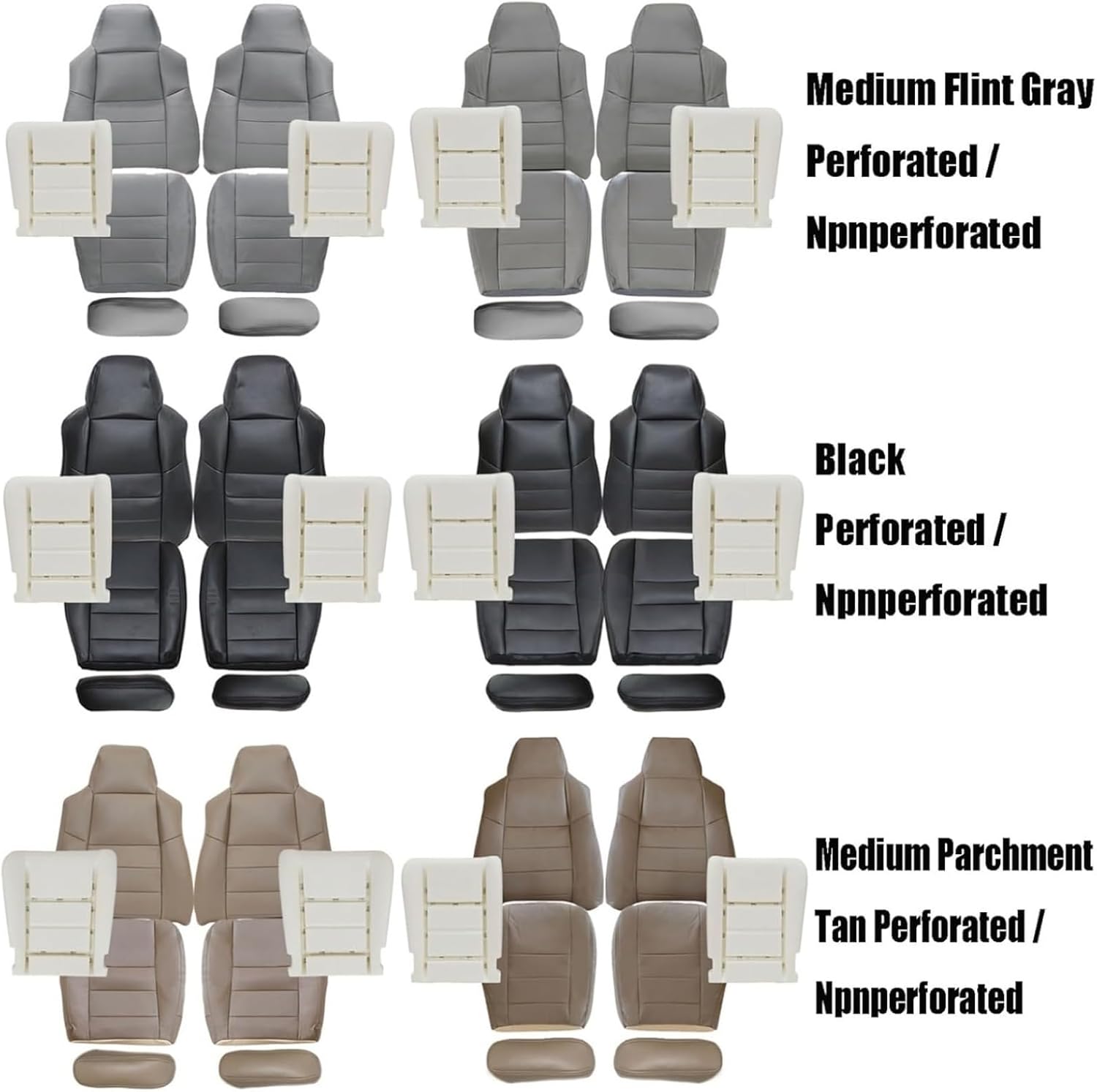 Type: Replacement seat coversPlacement: Front seatsMaterial: Microfiber LeatherLeather Color: Medium Flint Gray-Perforated/Non Perforated Microfiber LeatherMedium Parchment Tan-Perforated/Non Perforated Microfiber LeatherBlack-Perforated/Non Perforated Microfiber LeatherInner Liner: 1/2 & 1/4 Inch PaddingHeated Seats: Fits Heated Seats and Non Heated SeatsPower Seats: Fits Power Seats and Non Power Seats VehiclesFitment:Compatible with Ford F-250 Lariat, XLT with Leather, Crew-Cab, Single-Cab, 2WD, 4X4, 5.4L 6.8L Gas, 7.3L 6.0L Power Stroke Turbo Diesel 2002-2007Compatible with Ford F-350 Lariat, XLT with Leather, Crew-Cab, Single-Cab, 2WD, 4X4, 5.4L 6.8L Gas, 7.3L 6.0L Power Stroke Turbo Diesel 2002-2007Compatible with Ford F-450 Lariat, XLT with Leather, Crew-Cab, Single-Cab, 2WD, 4X4, 5.4L 6.8L Gas, 7.3L 6.0L Power Stroke Turbo Diesel 2002-2007Compatible with Ford F-550 Lariat, XLT with Leather, Crew-Cab, Single-Cab, 2WD, 4X4, 5.4L 6.8L Gas, 7.3L 6.0L Power Stroke Turbo Diesel 2002-2007