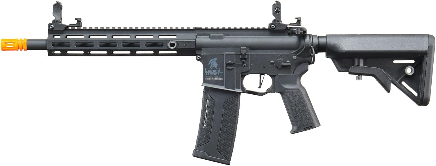 Specifications: Brand: Lancer Tactical Operation: Electric Automatic Construction: Nylon Polymer Frame / Metal Barrel Assembly Firing Modes: Semi-Automatic, Full-Automatic, and Functioning Safety Muzzle Velocity: 380 - 400 FPS (w/ 0.20g BBs, high FPS spring *installed*), 330 - 350 FPS (w/ 0.20g BBs, low FPS spring *not included*) Magazine Capacity: 140 Round High Speed Mid-Capacity Magazine (Compatible with most M4 magazines) Battery: 11.1v Stick Lipo Recommended (Battery and charger not included) Battery Connector: Rear Wired Via Deans Connector Gearbox: Full Metal Version 2 Hop-Up: Yes, Adjustable Rotary Style Handguard Length: 13 inches Inner Barrel Diameter: 6.03mm Length: 31.5 - 35 inches (Stock Retracted / Extended) Weight: 5 lbs
