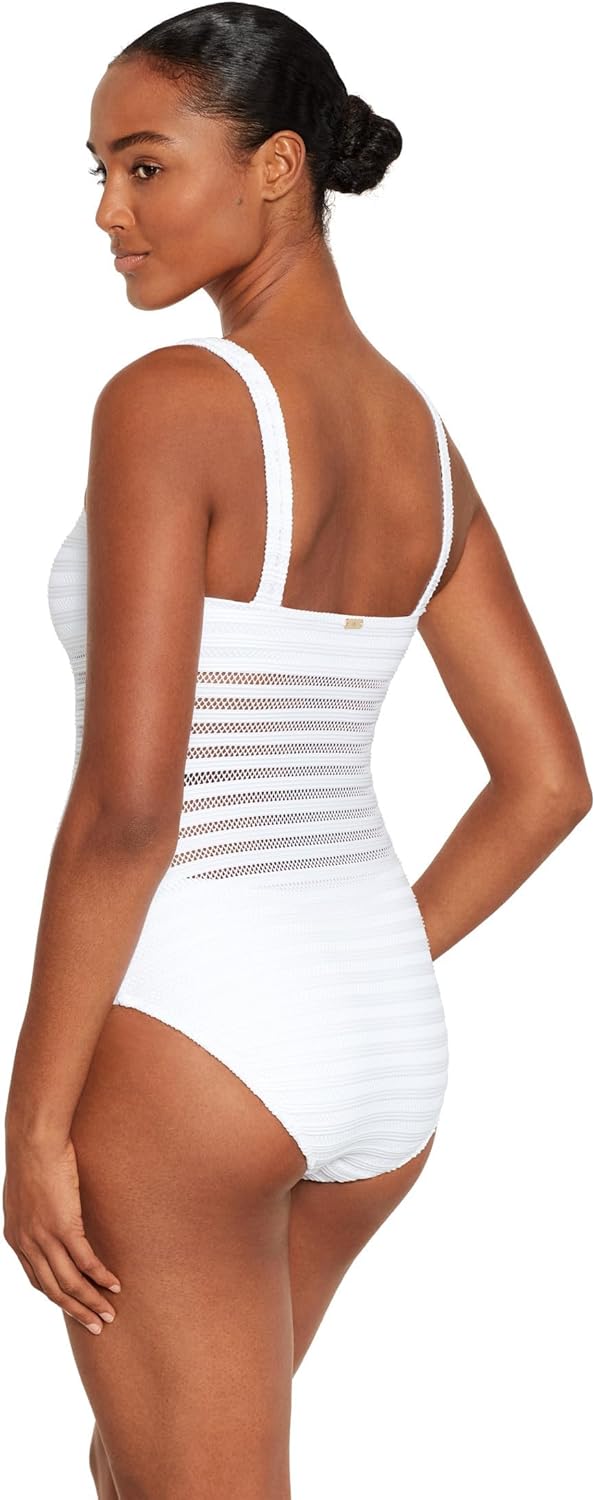 The LAUREN Ralph Lauren Ottoman Mesh Square Neck Over the Shoulder One Piece is designed to boost confidence and make a statement. The classic fit swimwear features removable soft cups, lining on the bra top and bottom, and metal plaque brand detailing on the center back of the neck. Square neckline. Sleeveless construction. Pull-on style. Full coverage. High-cut thighs. Shell: 95% polyester, 5% elastane; Lining: 83% nylon, 17% elastane. Hand wash. Imported.