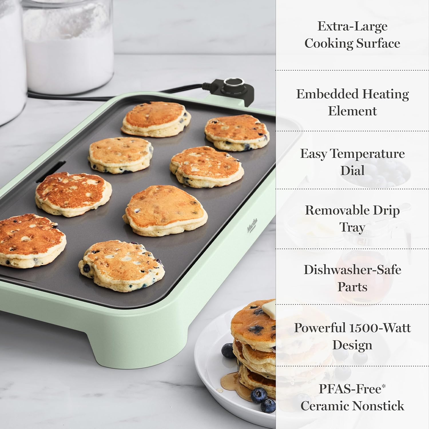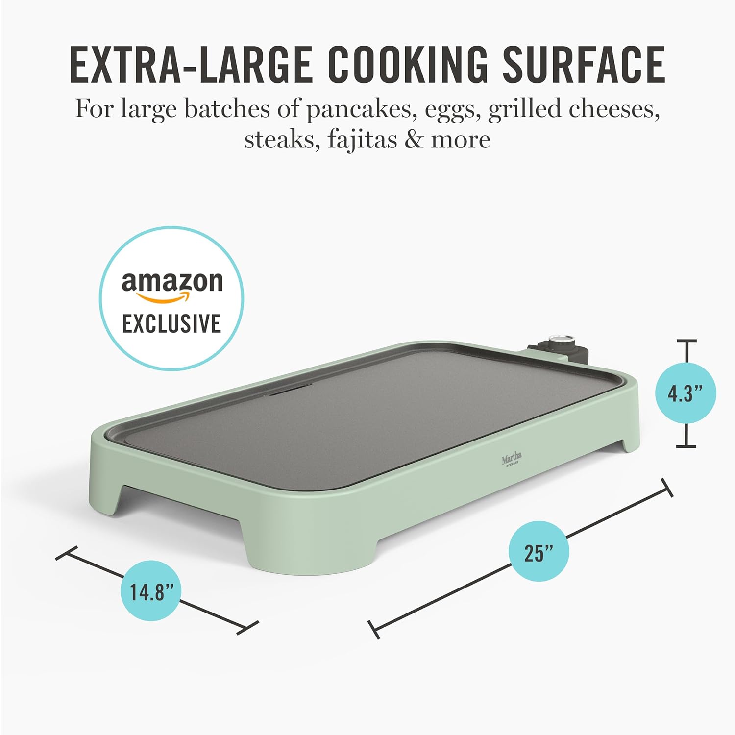 From Sunday brunch to weeknight dinners, the Martha 22 in x 12 in Griddle turns any meal into an effortless, crowd-pleasing experience. Its extra-large surface gives you room to cook multiple items at once, from pancakes and eggs to steaks and fajitas, while the embedded heating element ensures fast, even heating. Precision controls let you dial in the perfect temperature up to 400˚F, and the PFAS-free ceramic nonstick surface ensures easy food release without sticking. When you’re through, the griddle and drip tray are dishwasher safe for an easy cleanup, just be sure to remove the temperature probe first. This griddle blends convenience, performance, and versatility all in one.