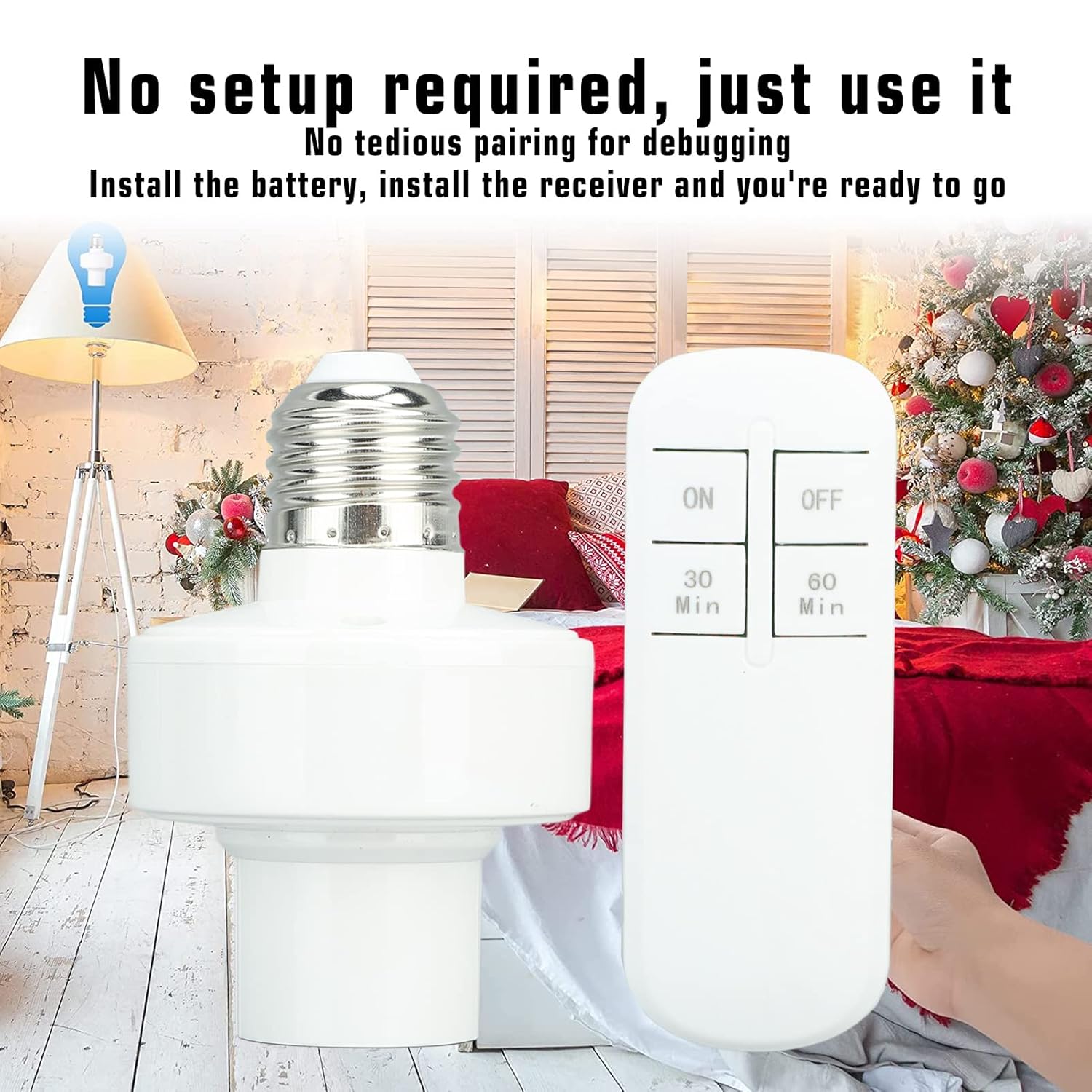 1. EASY TO INSTALL: Remote control light bulb socket is easy to install, you only need to screw the bulb into the receiving light port to realize remote control of electric lights.2. ANTI INTERFERENCE: Remote light bulb socket has strong anti interference and adopts digital IC for coding processing, which will not produce mutual control situation.3. LOW POWER CONSUMPTION: remote control light bulb socket adopts ultra low power consumption design, which saves energy and reduces consumption.4. EASY TO OPERATE: light bulb socket supports 360 degree control, no need to align control, can be remote control through the wall.5. APPLICABLE OBJECTS: Remote light socket is applicable to incandescent lamps, energy saving lamps, 100W LED bulbs and other kinds of E27 interface lamps.Spec:Item Type: Remote Control Light Bulb SocketMaterial: ABSGross Weight: 113g/4.0ozLamp Socket Size: Approx. 6x6x9.5cm / 2.4x2.4x3.7inApplicable Interface: E27 Interface BulbRemote Control: 2 x AAA Batteries (Shipped Without Batteries)Applicable Incandescent Lamps, Energy Saving Lamps, 100W LED Bulbs and Other Kinds of Lamps and LanternsHow to Use:1. Before installation, maintenance and removal, please make sure that the external power supply has been cut off.2. When installing, screw the screw port ordinary light bulb, energy saving lamp or LED light bulb (not included) into the remote control lamp holder, screw the remote control lamp head into the original lamp holder at home; open the transmitter, put the battery matched with the product into the battery box according to the polarity requirement; connect the external power, lightly press the transmit button, you can realize the remote control of electric lights.3. For your safety and service life of the product, please make sure not to let the product work the maximum load power.4. In the case of strong electromagnetic interference, the