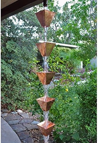 The Extra Large Square Cups Rain Chain is the largest available. The Extra Large Square Cups have beautifully clean, straight lines. Individually crafted by hand, each side is press seamed for superior strength and durability. Available in pure copper, raw aluminum, and aluminum with Black, Bronze, or Patina powder-coat. Lengths of 20 feet and longer are not recommended due to the weight of this rain chain. We do not advise installing long drops of this chain in colder climates. To prevent damage in transit and reduce packaging volume, the upper wires are shipped separately from the cups, so some assembly is required. Assembly takes just a few minutes with no tools. Each rain chain comes with a matching v-hook. The v-hook sits inside the gutter opening to hold the rain chain in place.