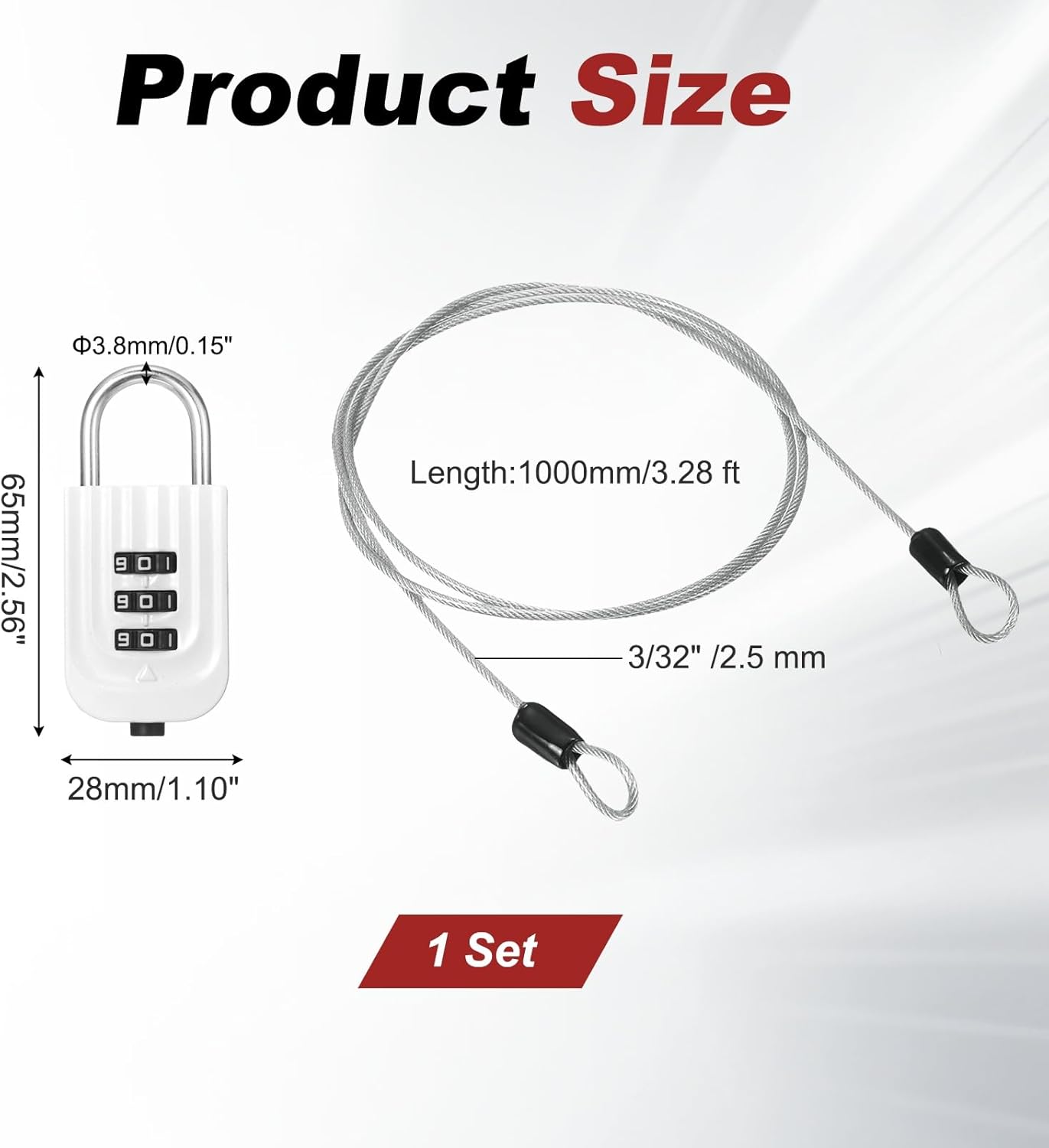 Reasons for Selection - Double loop security cable is crafted from premium stainless steel, which features rust prevention, corrosion resistance, high toughness and aging resistance. Equipped with a zinc alloy 3-digit combination lock, the password wheel rotates smoothly without jamming, allowing it to be opened without a key and providing reliable protection.Measurement - Steel Cable Size: 1000 x 2.5 mm / 3.28 ft x 3/32 inch (L*D); Combination Size: 28 x 65 mm / 1.10 x 2.56 inch (W*H); Shackle Diameter: 3.8 mm / 0.15 inch; Package Include: 1Pcs x Steel Cable and 1Pcs x 3 Digit Combination Lock.Suitable for - Bicycle cable lock is suitable for locking helmets, bicycles, motorcycles, sports equipment, fences, toolboxes, suitcases, etc., effectively preventing loss and ensuring the safety of your belongings, which can also be used as a clothesline, net hanging device, animal leash and binding strap.Installation - The default combination is 000. Press and hold the reset button into the slot, then enter your new combination. Thread the security steel cable through the items you need to secure, and then lock it with a lock.Kind Tips - Please confirm the size before purchasing. It is recommended to apply lubricant regularly to extend the lock's lifespan.