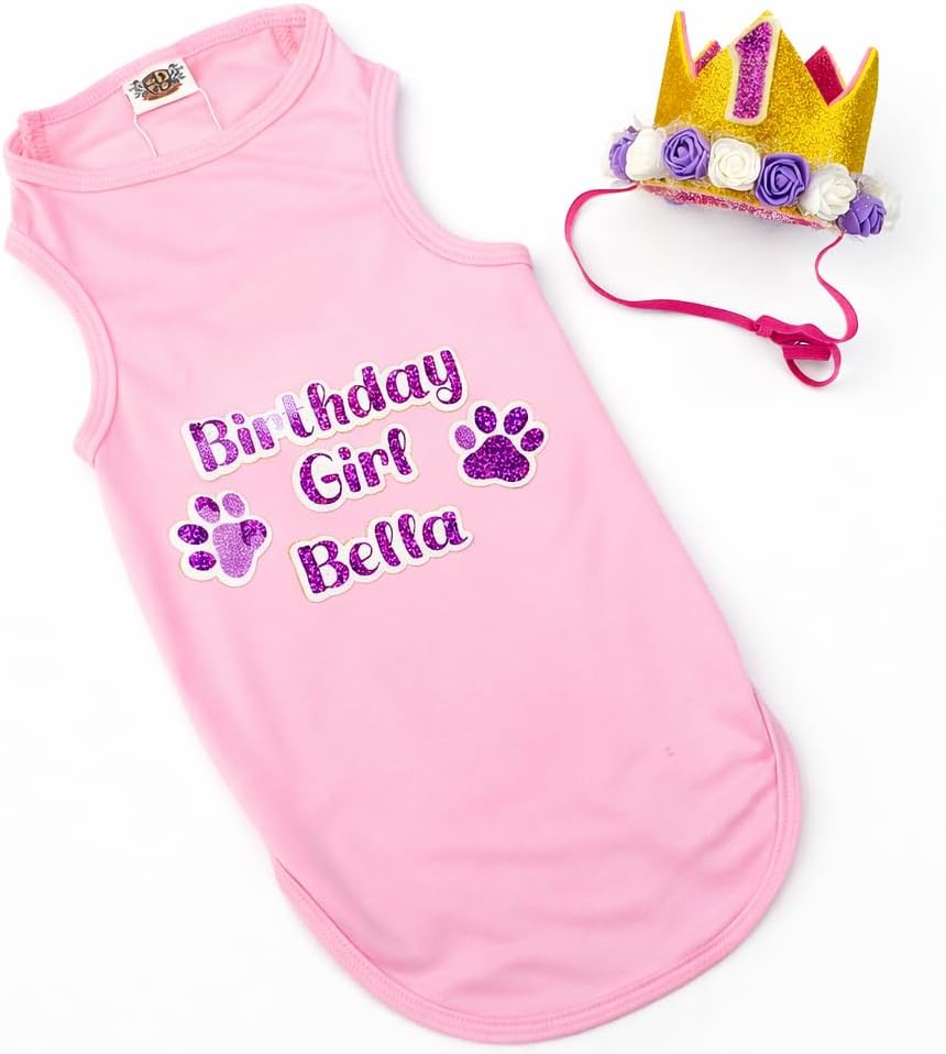 Our personalized pink and purple birthday outfit will have your fancy furbaby feeling extra special on their birthday or gotcha day. Package includes: - Birthday Girl Shirt with your pet's name added - purple and gold dot adjustable tutu with sequin bow - Gold Sparkle Flower Crown. A terrific fit for breeds between 3 lbs to 100 lbs! Choose your pet's best size, based on the sizing chart shown in the pictures. Please measure carefully.