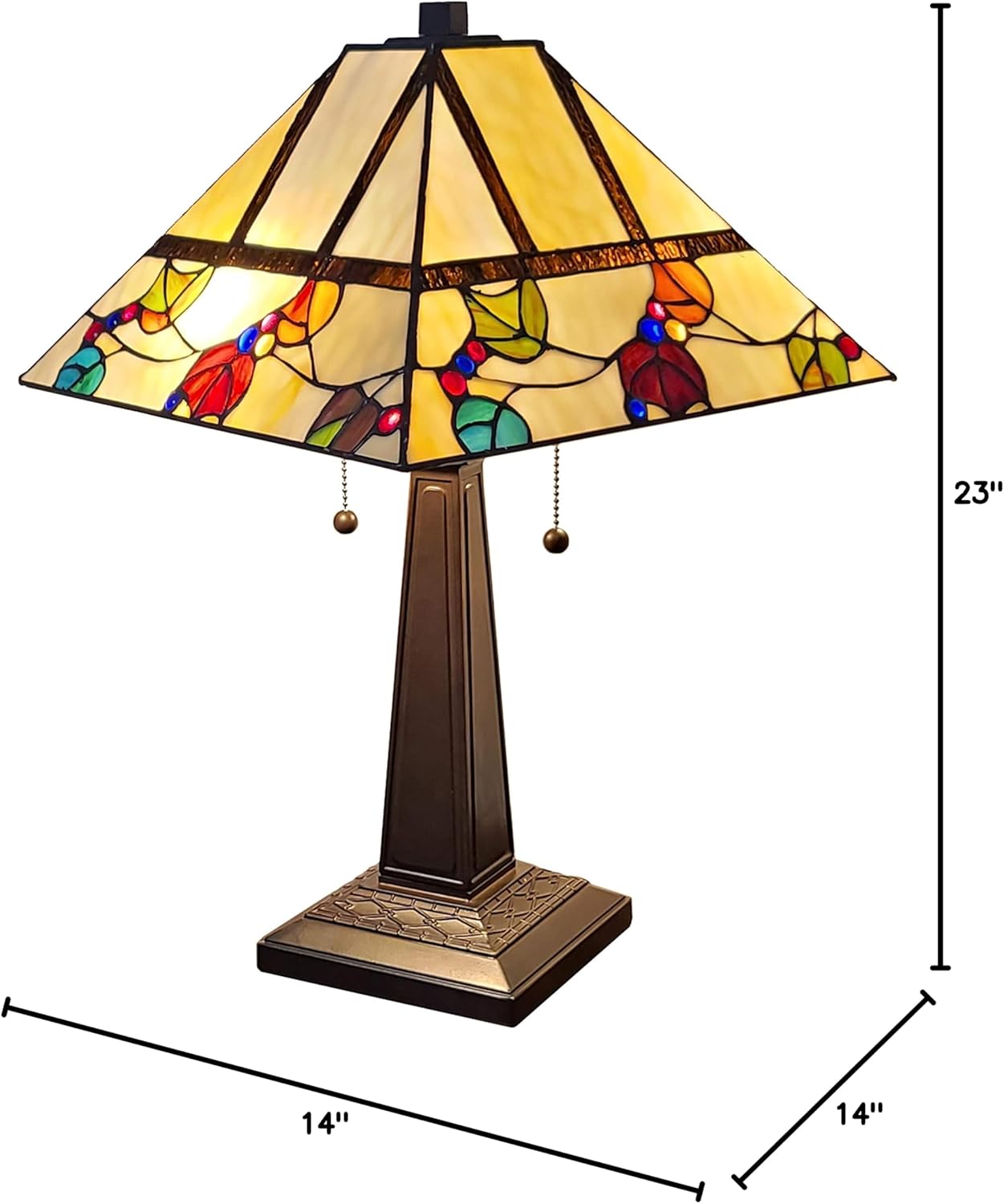 With warm tones and classic lines, this Amora Lighting table lamp is a beautiful mission-style piece featuring berries and leaves meandering through it's glass. This Tiffany Style lamp is handcrafted using the same techniques that were developed by Louis Comfort Tiffany in the early 1900s. 160 cut glass pieces 32 glass jewel pieces Certification: UL Listed Materials: Glass shade, zinc base Setting: Indoor Base finish: Dark brown Number of lights: Two (2) Requires: Two (2) 60-watt E27 Type A bulb (not included) Switch type: Pull chains Dimensions: 22 inches high x 14 inches wide Shade itself is 7. 25 inches tall Attention California residents: This product contains lead, a chemical known to the state of California to cause cancer and birth defects or other reproductive harm. Note: Shade colors will appear darker and less vibrant when not illuminated. This stained glass product has been protected with mineral oil as part of the finishing process. Please use a soft dry cloth to remove any excess oil.